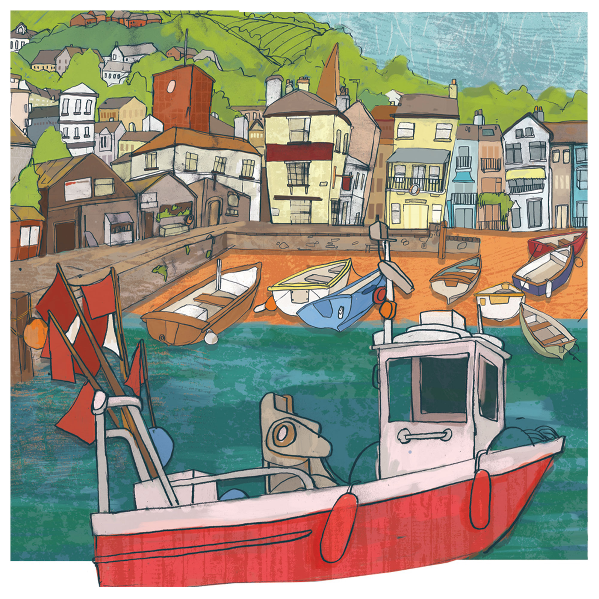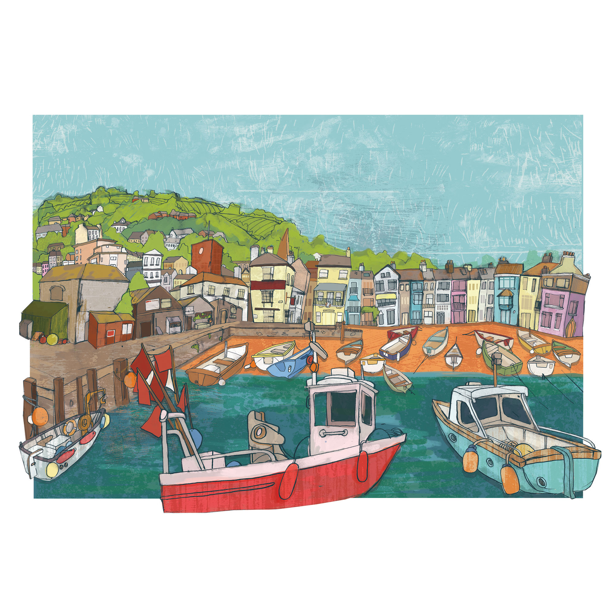 An image of Teignmouth Back Beach showing fishing and regatta boats lining the sand. This illustration captures some of the best bits of the town including The Ship Inn and the New Quay.